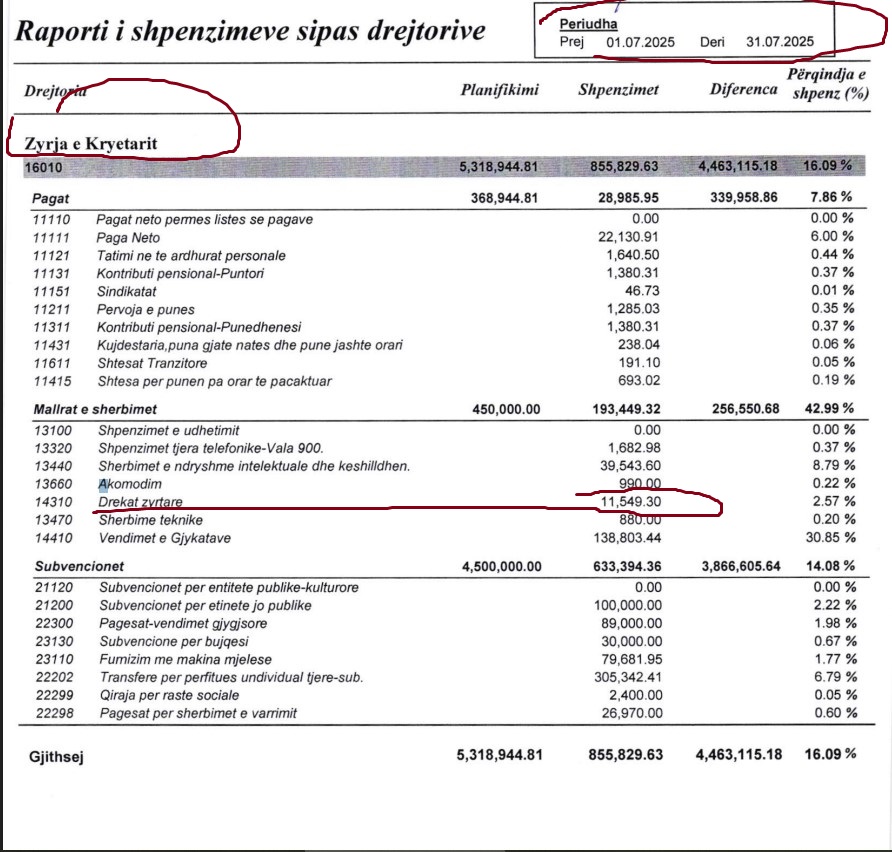 Shpenzimet totale të Zyrës së Kryetarit për korrik arrijnë në 368,924.81 euro për paga, ku pjesa më e madhe shkon për pagat e stafit. Por jo vetëm paga: Zyra ka shpenzuar gjithashtu 193,449.32 euro për mallra dhe shërbime, duke treguar se “lluksi zyrtar” nuk kursen kur bëhet fjalë për furnizime dhe shërbime të ndryshme.