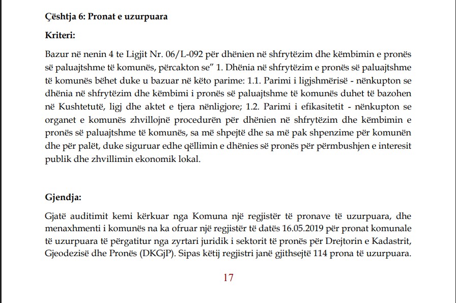Sipas auditimit, Komuna e Gjilanit kishte evidentuar në vitin 2019 gjithsej 114 prona të uzurpuara nga paslufta deri në atë kohë, por asnjë listë nuk ekziston për pronat e liruara apo për veprimet konkrete që janë ndërmarrë për rikthimin e tyre.