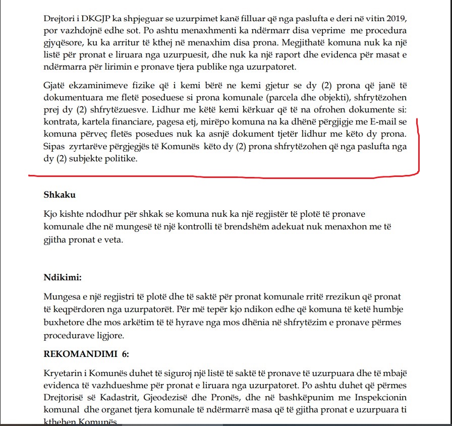 Sipas ZKA-së, kjo situatë ka ardhur si pasojë e mungesës së një regjistri të plotë të pronave komunale dhe të kontrollit të brendshëm adekuat. Auditorët theksojnë se uzurpimi jo vetëm që dëmton buxhetin komunal dhe pengon arkëtimin e të hyrave, por paraqet edhe keqpërdorim të pastër të pasurisë publike për interesa partiake, raporton Kujdestari.info.
