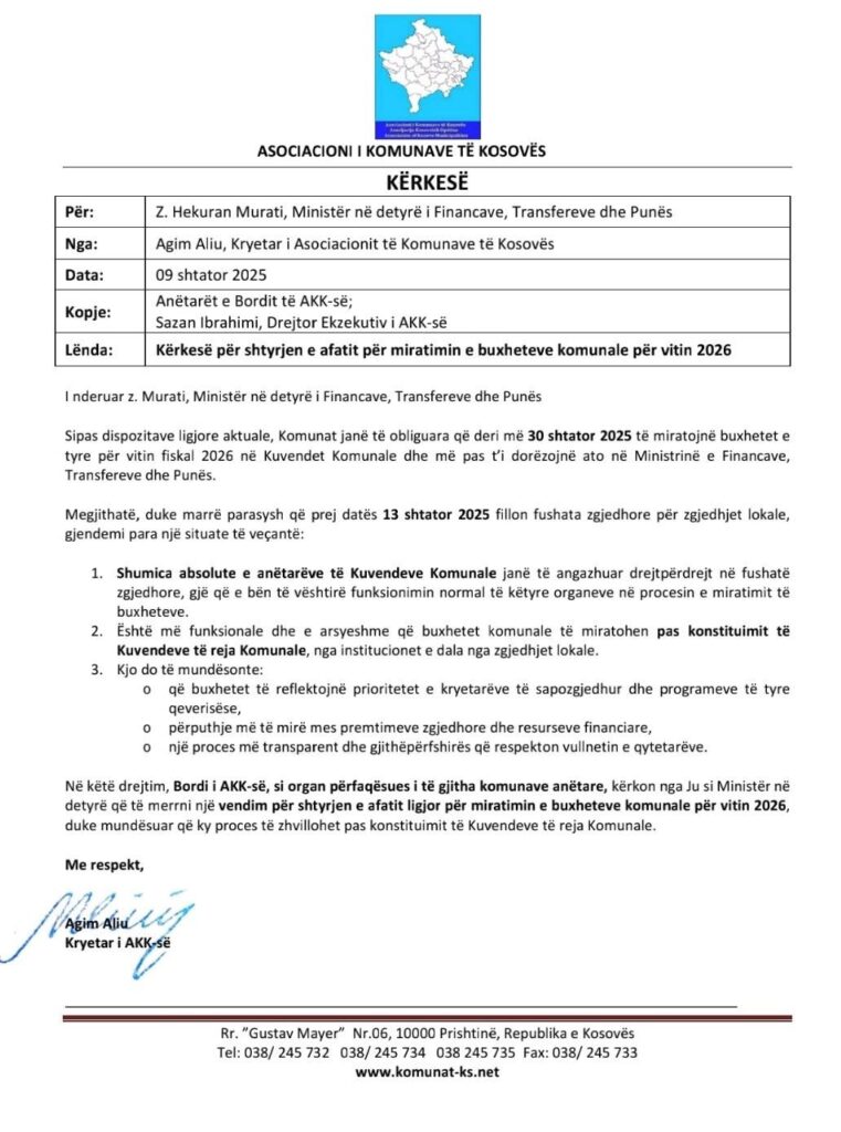 Bordi i Asociacionit të Komunave të Kosovës i ka dërguar kërkesën Ministrit në detyrë të Financave, Transfereve dhe Punës, Hekuran Murati për shtyrjen e afatit ligjor për miratimin e buxheteve komunale për vitin 2026.