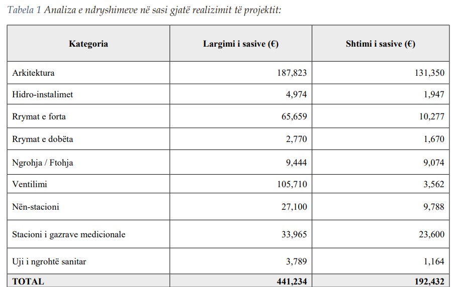Nga tabela më lartë vërehet se gjatë realizimit të projektit janë bërë ndryshime të konsiderueshme në sasitë e pozicioneve të ndryshme brenda secilës kategori, krahasuar me kontratën fillestare. Në disa pozicione sasitë janë zvogëluar, në vlerë prej 441,234 € dhe disa pozicione sasitë janë shtuar në vlerë prej 192,432€, duke rezultuar në një ulje neto prej 248,802 € nga vlera fillestare e kontratës.