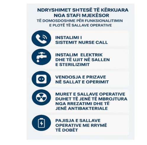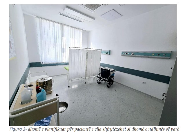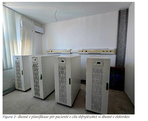 Gjatë inspektimit fizik të objektit, kemi konstatuar se një hapësirë e dedikuar për vendosjen e pajisjeve elektrike (orman elektrik dhe UPS) nuk ishte ndërtuar në harmoni me përmasat e pajisjeve dhe nuk i plotësonte kushtet teknike për vendosjen dhe funksionimin e tyre. Si rrjedhojë, kësaj dhome i’u është ndërruar destinimi dhe tani përdoret për qëllime tjera, ndërsa një dhomë e planifikuar për pacientë tani shfrytëzohet për vendosjen dhe funksionimin e këtyre pajisjeve.