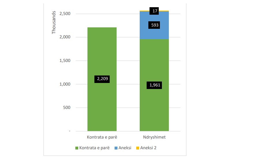 Lidhja e kontratës së dytë, për punë të paparashikuara, ka rezultuar me rritje të kostos së projektit për afër 0,6 milion euro. Nga kjo, shuma e kontratës së parë dhe asaj të dytë kap vlerën mbi 2,55 milion euro.