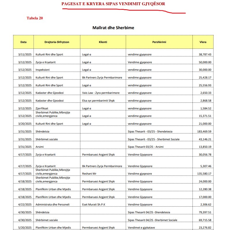Raporti përfshin gjithashtu një tabelë të veçantë të pagesave të kryera sipas vendimit gjyqësor në kuadër të kategorisë mallra dhe shërbime.