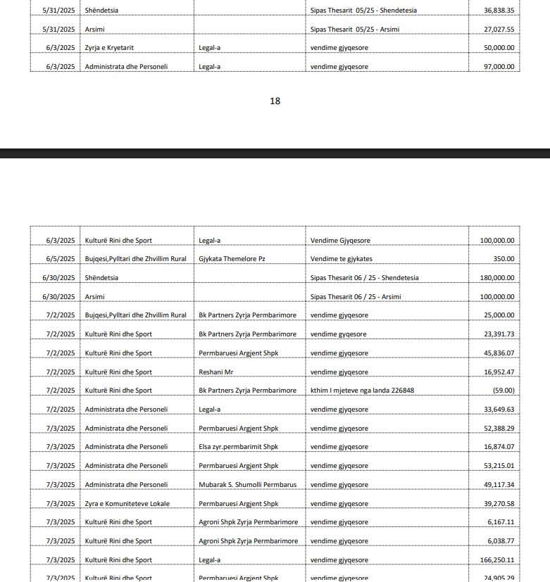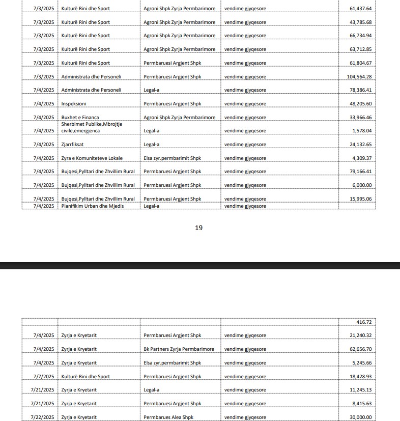 Këto pagesa janë bërë përmes dhjetëra transaksioneve gjatë vitit, të shpërndara në disa drejtori komunale, përfshirë: