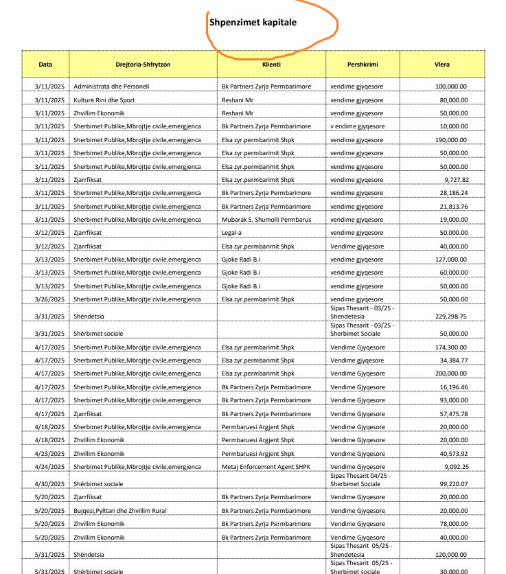 Nga lista e detajuar e pagesave në kuadër të shpenzimeve kapitale, rezulton se 7,343,992.89 euro janë shpenzuar për vendime gjyqësore dhe përmbarime