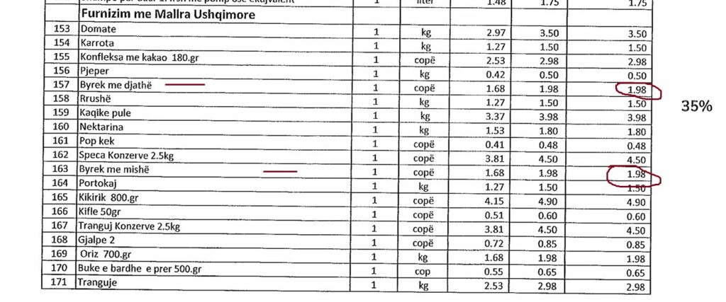 Në kontratën aktuale të Skenderajt, bie në sy çmimi për disa produkte ushqimore bazike. Byreku, për shembull, figuron me një çmim prej 1.98 euro për njësi, ndonëse në furrat private në Skenderaj çmimi i tij sillet rreth 1.20 euro. Buka blihet nga komuna me 65 cent, ndërsa në tregun lokal çmimi i zakonshëm është rreth 50 cent, konkretisht nw Skenderaj. Edhe domatet janë kontraktuar me çmim prej 3.5 euro për kilogram, një vlerë që shpesh tejkalon çmimet sezonale në treg, veçanërisht gjatë verës. Vaji 1 kg me çmim prej 1.95 euro, i cili ne treg kushton rreth 1.55 euro.