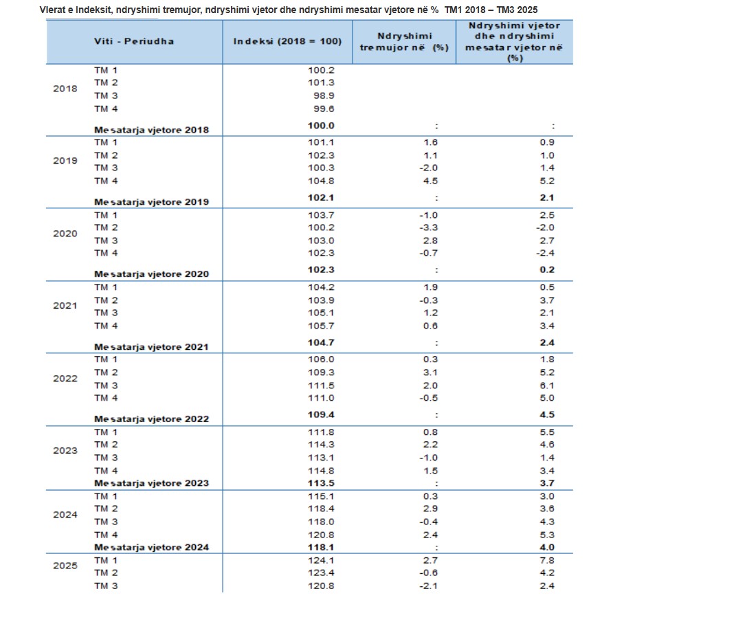Mesatarja vjetore e indeksit për vitin 2024 ishte 118,1 pikë, me një rritje mesatare vjetore prej 4,0 për qind, ndërsa të dhënat e vitit 2025 tregojnë një ngadalësim të dukshëm të ritmit të rritjes.