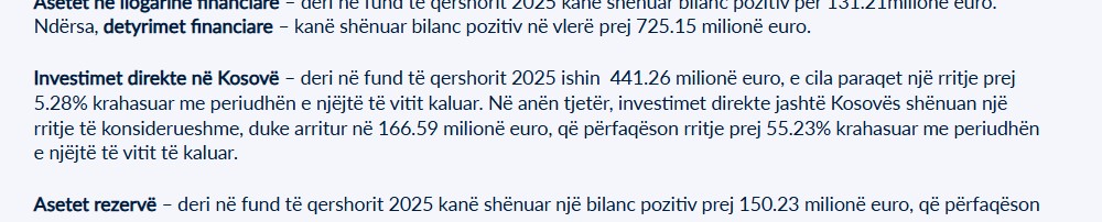 Sipas raportit, deri në fund të qershorit, investimet direkte në Kosovë arritën vlerën 441.26 milionë euro, duke shënuar një rritje prej 5.28% krahasuar me periudhën e njëjtë të vitit të kaluar.