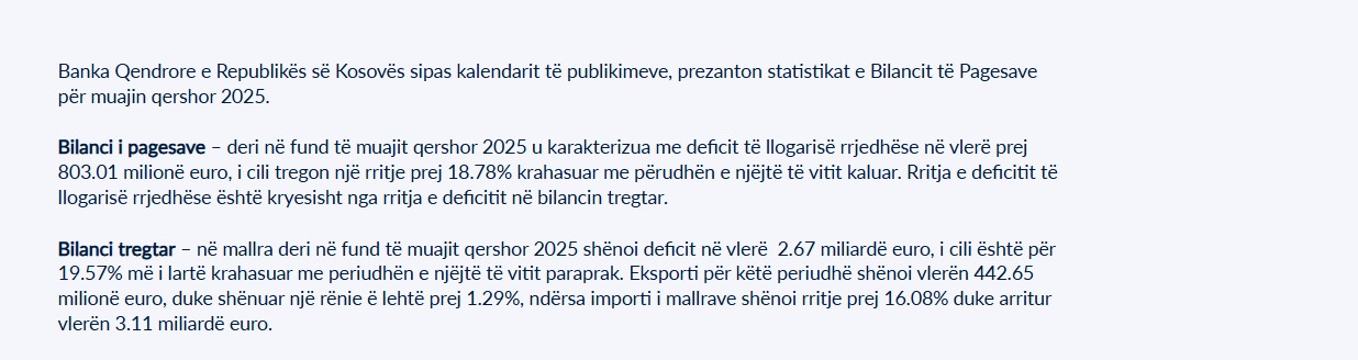 Sipas raportit, deri në fund të muajit qershor 2025, llogaria rrjedhëse që mat hyrjet dhe daljet e parave nga tregtia e mallrave, shërbimeve dhe transfertave me botën e jashtme – ka shënuar deficit prej 803.01 milionë euro. Kjo shifër është për 18.78% më e lartë krahasuar me periudhën e njëjtë të vitit të kaluar.