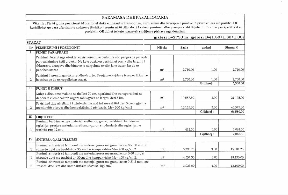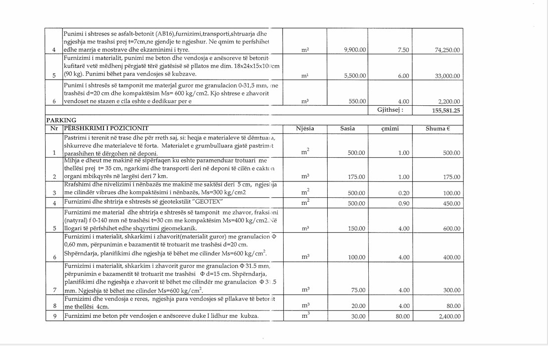 - Shtresa e tamponit me material guror 0–60 mm, trashësi 30 cm, Ms=400 kg/cm². Dyshohet se nuk është realizuar: 4,537.50 m³ x 4.00 € = 18,150.00 €.