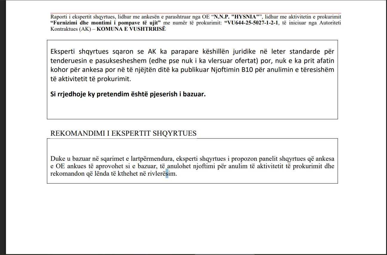 Ne fund ai ka shkruar “Duke u bazuar në sqarimet e lartpërmendura, eksperti shqyrtues i propozon panelit shqyrtues që ankesa e OE ankues të aprovohet si e bazuar, të anulohet njoftimi për anulim të aktivitetit të prokurimit dhe rekomandon që lënda të kthehet në rivlerësim”