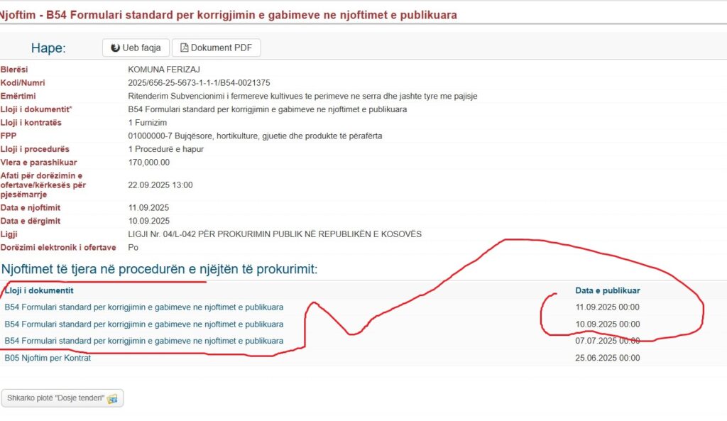 Vendimi i panelit është marrë më 3 shtator, ndërsa Komuna e Ferizajt, më datat 10 dhe 11 shtator, ka ngritur në E-prokurim dy formularë standardë për korrigjimet e njoftimit për kontratë, duke bërë disa ndryshime. Megjithatë, mbetet të shihet nëse do të ketë përsëri ankesa lidhur me ndryshimet specifike të tenderit, për të cilat është thënë se i ishin përshtatur një operatori të caktuar. /Kujdestari.info/