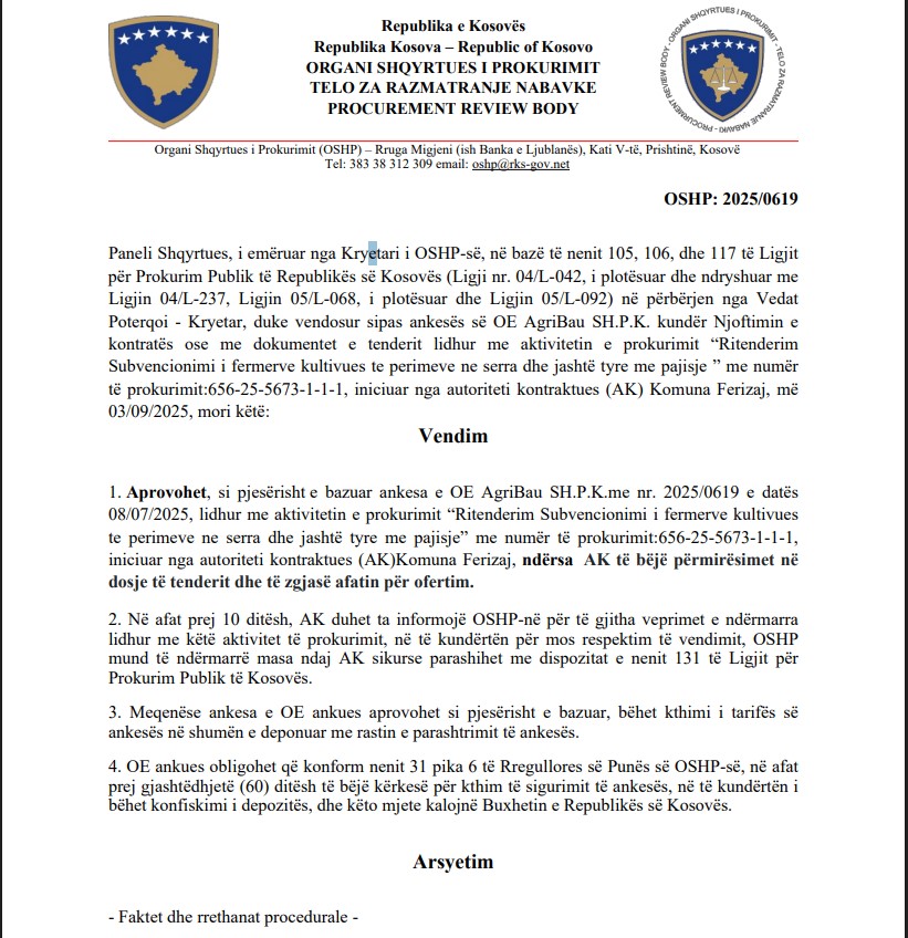 Pas shqyrtimit të plotë, Paneli OSHP-sw e aprovoi pjesërisht ankesën dhe urdhëroi Komunën e Ferizajt që të përmirësojë dosjen e tenderit, të largojë kriteret diskriminuese dhe të zgjerojë afatin për ofertim. Në të kundërtën, sipas ligjit, komuna mund të përballet me masa ndëshkuese. Po ashtu, kompania ankueses i kthehet tarifa e ankesës.