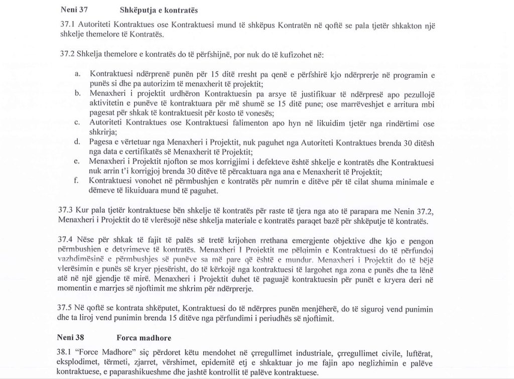 Sipas Neni 37 të kontratës, autoriteti kontraktues mund ta ndërpresë kontratën në rast të shkeljeve themelore, siç janë ndërprerja e punës për më shumë se 15 ditë pa autorizim, ose moskorrigjimi i defekteve brenda afateve të përcaktuara.