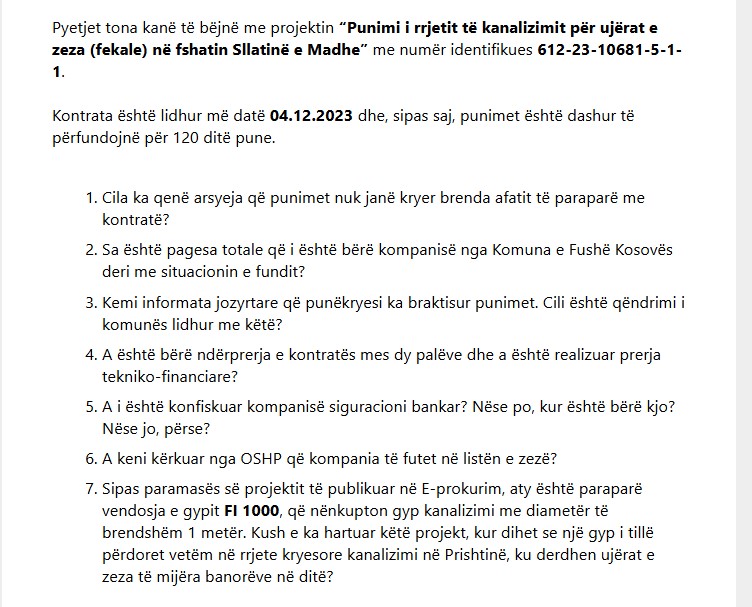 Demokracia.com i ka dërguar Komunës së Fushë Kosovës pyetje lidhur me arsyet e vonesës, pagesat e kryera, statusin e kontratës, si dhe justifikimin për vendosjen e dy gypave DN-1000. Komuna nuk ka kthyer asnjë përgjigje. /Demokracia.com/