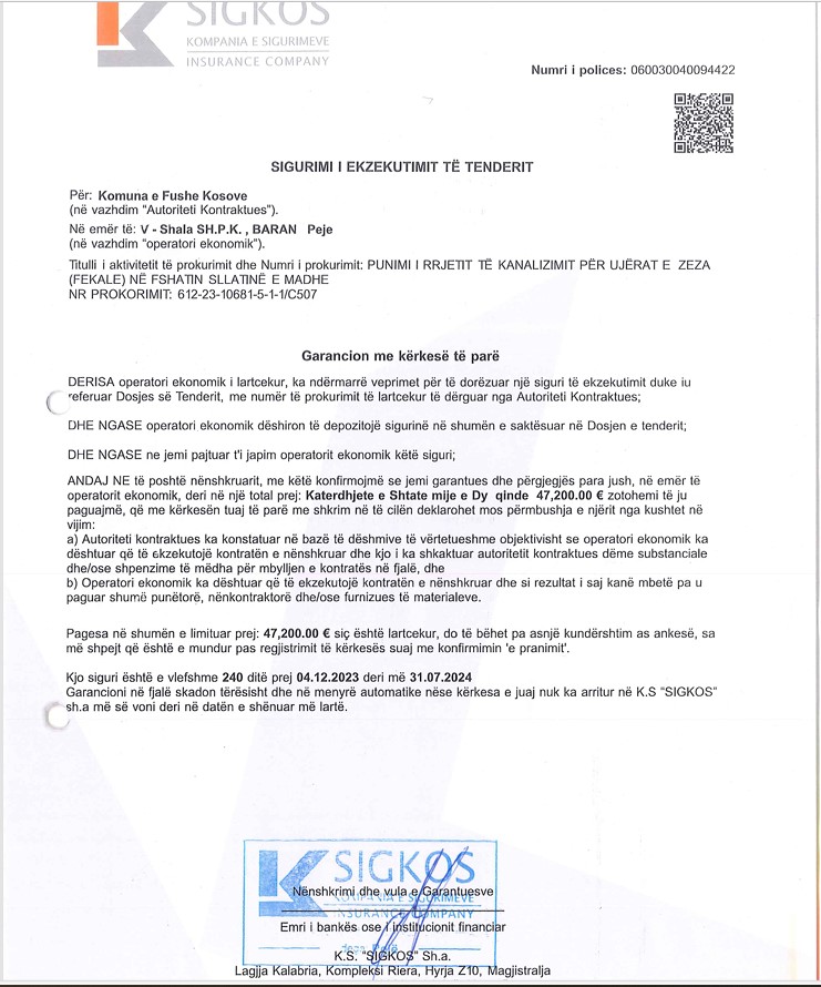 Kontrata në mes të Komunës së Fushë-Kosovës dhe kompanisë “V-Shala” Sh.p.k., me vlerë prej 472 mijë euro, është nënshkruar më 4 dhjetor 2023, ndërsa punimet është dashur të përfundojnë më 30 gusht 2024. Megjithatë, nga gjatësia totale e kontraktuar prej 5,030 metrash, janë realizuar vetëm rreth 190 metra, apo afërsisht 4% e punimeve.