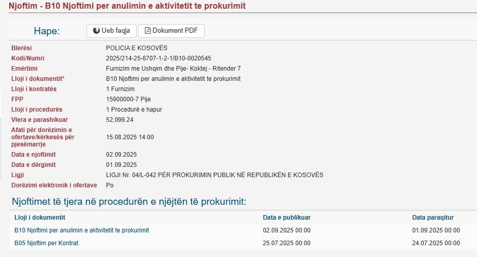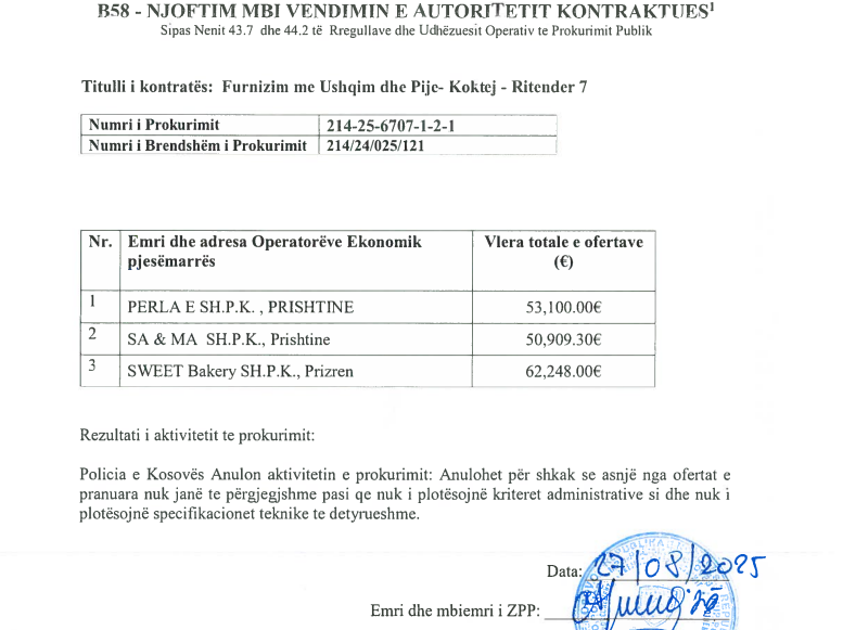 Policia e Kosovës ka anuluar ritenderin për Furnizim me Ushqim dhe Pije për organizimin e Koktejëve.