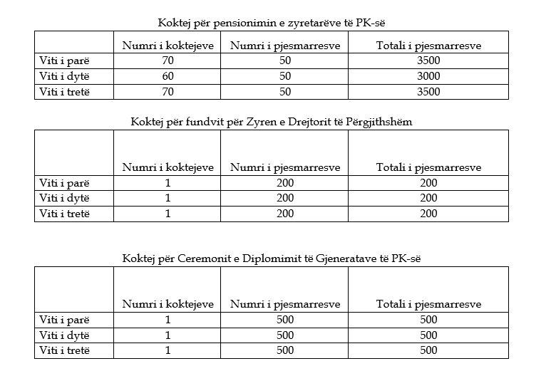 Policia e Kosovës në këtë tender kishte paraparë organizimin e koktejëve për pensionimin e policëve të Kosovës, festat e fundvitit për drejtorin e përgjithshëm dhe koktejë për diplomimin e gjeneratave në PK.