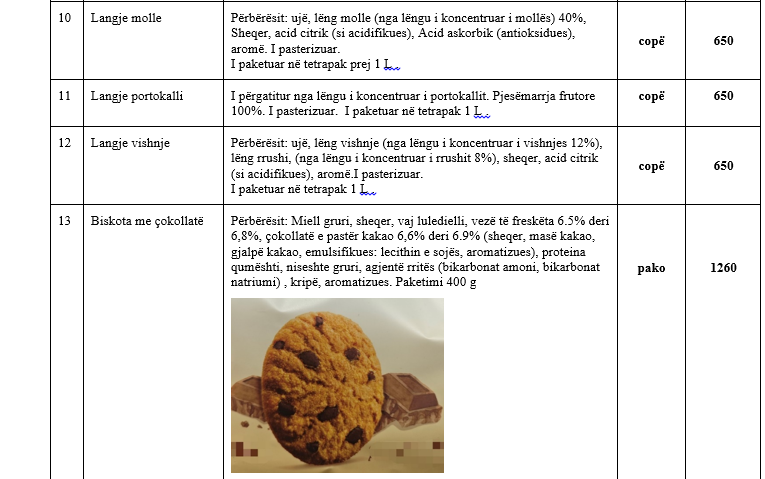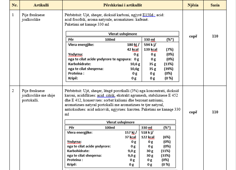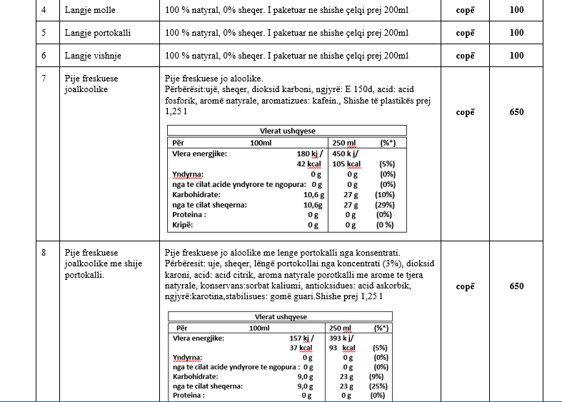 Po ashtu, Policia e Kosovës kishte kërkuar edhe pije të ndryshme, si lëngje, pije joalkoolike, pije joalkoolike me shije limoni, portokalli, e tjera.