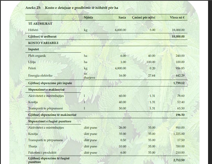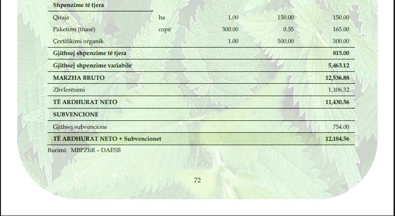 Në anën tjetër, shpenzimet e përgjithshme – duke përfshirë plehun organik, ujitjen, energjinë elektrike për tharje, fuqinë punëtore, transportin, paketimin dhe certifikimin organik – llogariten në 5,463 euro për hektar. Pas këtyre zbritjeve, fitimi neto i fermerit mbetet 11,430 euro.