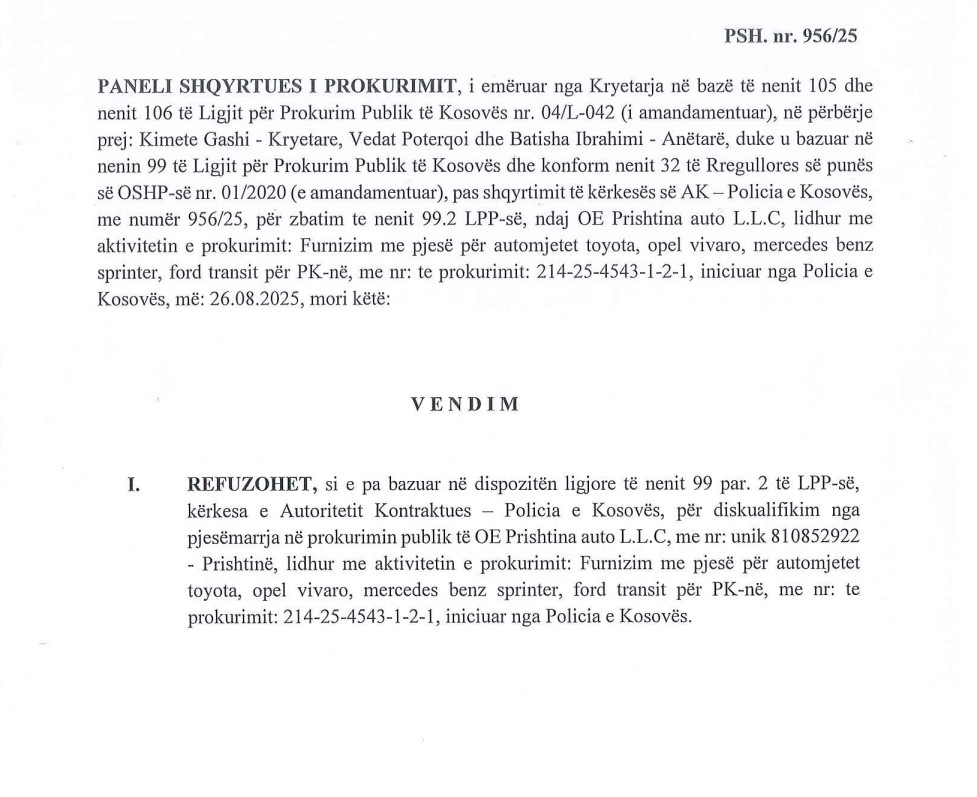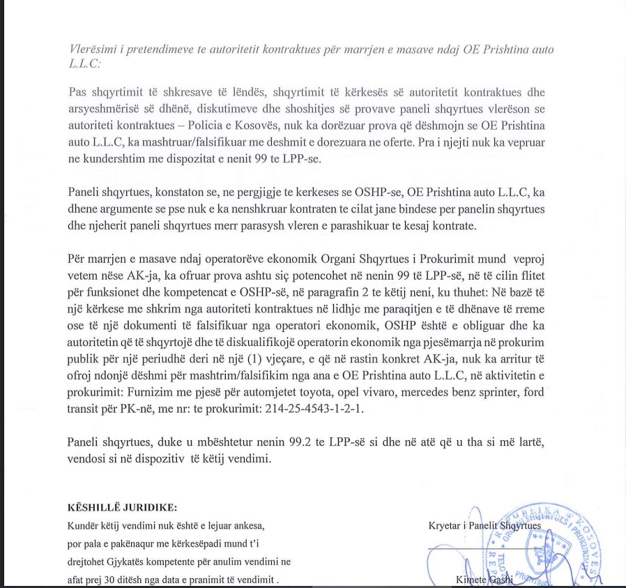 Organi Shqyrtues i Prokurimit (OSHP) ka rrëzuar kërkesën e Policisë së Kosovës për diskualifikimin e kompanisë “Prishtina Auto L.L.C” nga pjesëmarrja në prokurim publik, duke vlerësuar se autoriteti kontraktues nuk ka ofruar prova për mashtrim apo falsifikim, shkruan Kujdestari.info.