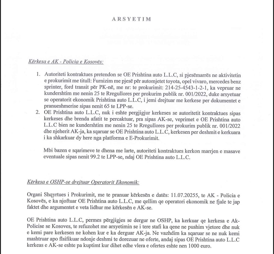 Policia e Kosovës kishte pretenduar se kompania “Prishtina Auto L.L.C”, e përfshirë në tenderin për furnizim me pjesë për automjetet Toyota, Opel Vivaro, Mercedes Benz Sprinter dhe Ford Transit, nuk iu përgjigj në kohë kërkesës për dokumentet e pranueshmërisë, duke vepruar në kundërshtim me nenin 25 të Rregullores për prokurim publik nr. 001/2022.