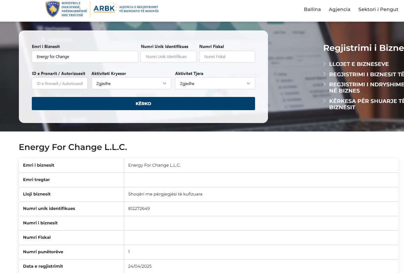 Sipas të dhënave të Agjencisë për Regjistrimin e Bizneseve të Kosovës (ARBK), kompania Energy For Change L.L.C. është themeluar në prill të vitit të kaluar dhe ka aktivitet kryesor tregtinë e energjisë elektrike.