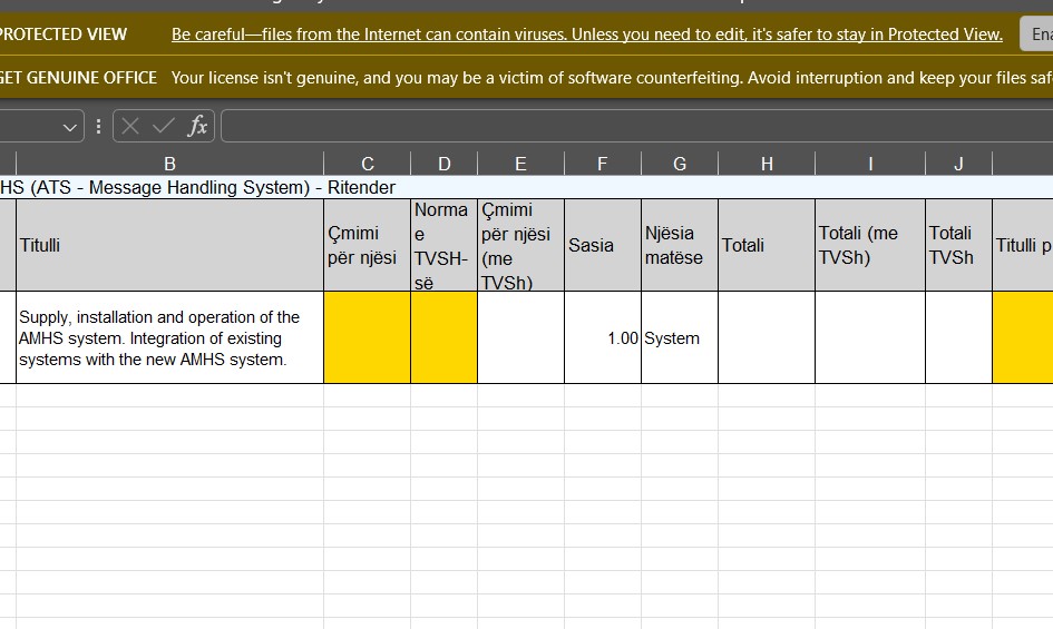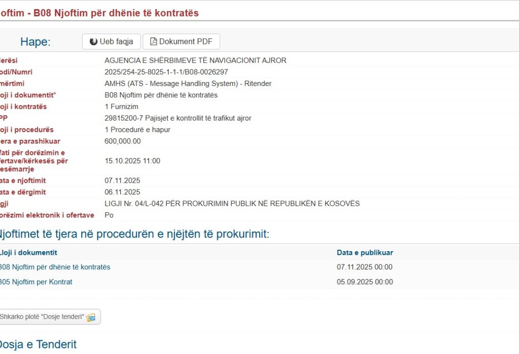 Sipas dokumentacionit të publikuar në platformën e prokurimit publik, tenderi parashihte: “Supply, installation and operation of the AMHS system, as well as integration of existing systems with the new AMHS system.”