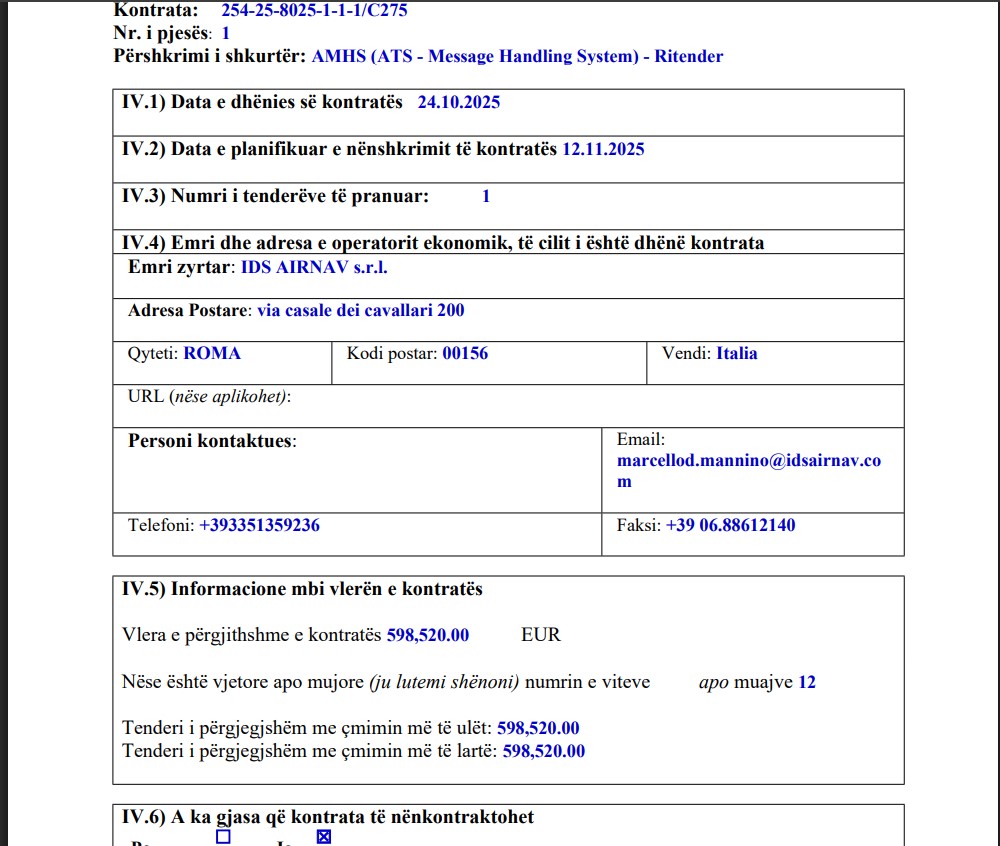 Kontrata është lidhur me kompaninë IDS AirNav S.r.l., me seli në Romë, Itali, e cila është pjesë e grupit shtetëror italian ENAV S.p.A., një nga operatorët më të njohur në Evropë në fushën e menaxhimit të trafikut ajror. Kjo kompani ka realizuar kontrata të ngjashme në disa vende të botës, përfshirë Zambinë, Fidzhin dhe Rumaninë.