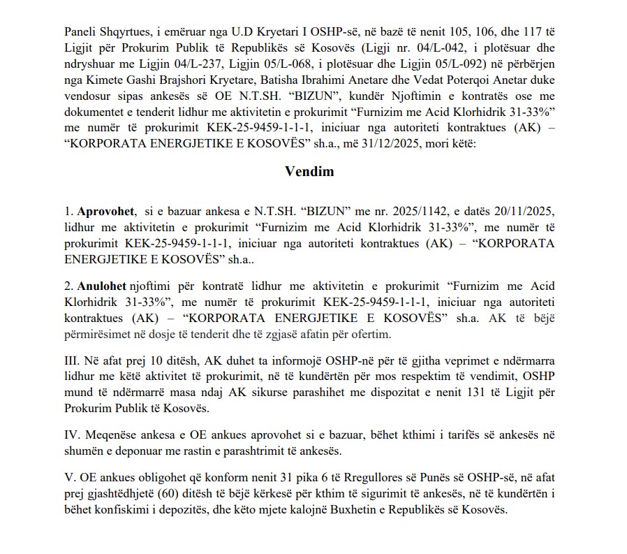 Korporata Energjetike e Kosovës (KEK) është zënë duke manipuluar procedurën e prokurimit publik për furnizim me acid klorhidrik, duke vendosur kritere teknike të panevojshme dhe diskriminuese me qëllim uljen e konkurrencës në treg. Kjo del qartë nga vendimi përfundimtar i Panelit Shqyrtues të Organit Shqyrtues të Prokurimit (OSHP), i cili ka aprovuar si të bazuar ankesën e operatorit ekonomik N.T.SH. “BIZUN” dhe ka anuluar njoftimin për kontratë të KEK-ut për tenderin me vlerë të parashikuar prej 884 mijë eurosh, shkruan Kujdestari.info.