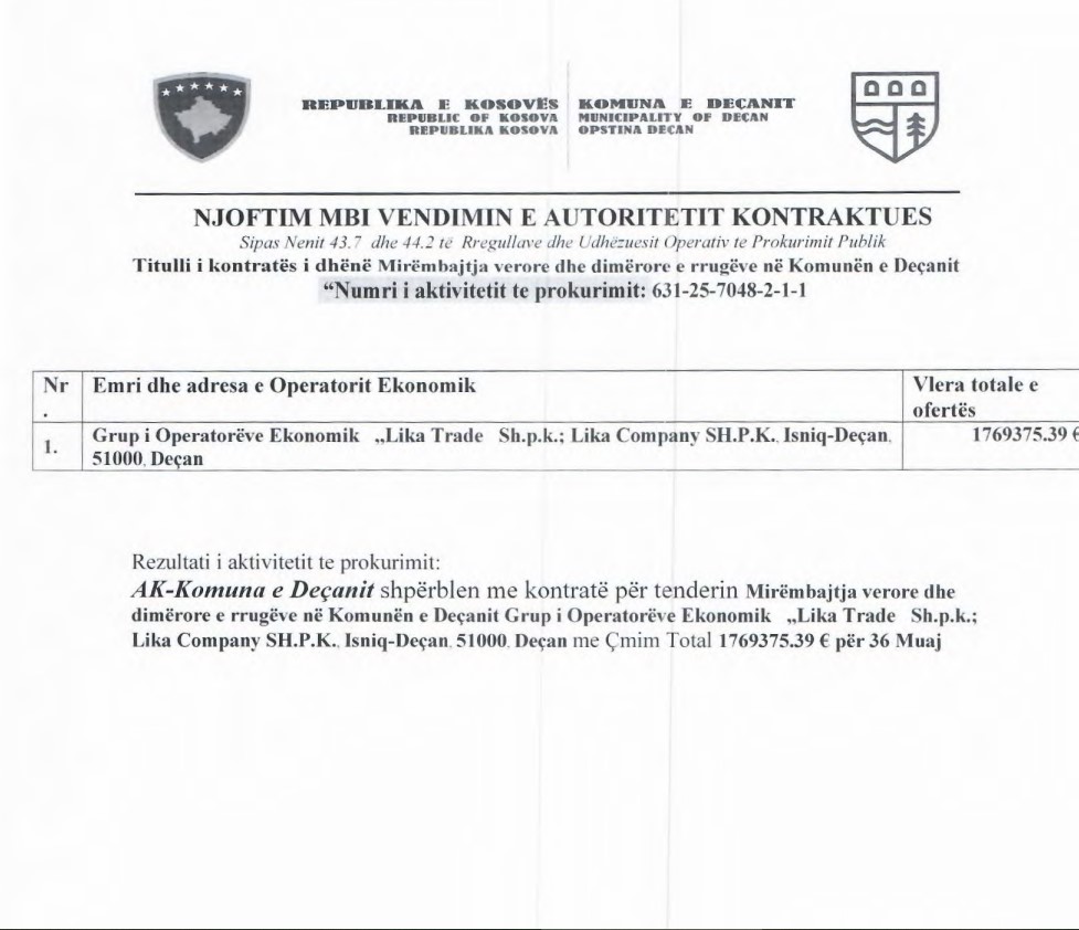 Tenderi i fundit në komunën e Deçanit e ka shpallur fitues kompaninë e njohur Lika. Bëhet fjalë për kontratën “Mirëmbajtja verore dhe dimërore e rrugëve në Komunën e Deçanit”, me kohëzgjatje 36 muaj, të cilën e ka fituar Lika Trade SH.P.K. dhe Lika Company SH.P.K., me një vlerë totale prej 1,769,375.39 eurosh.