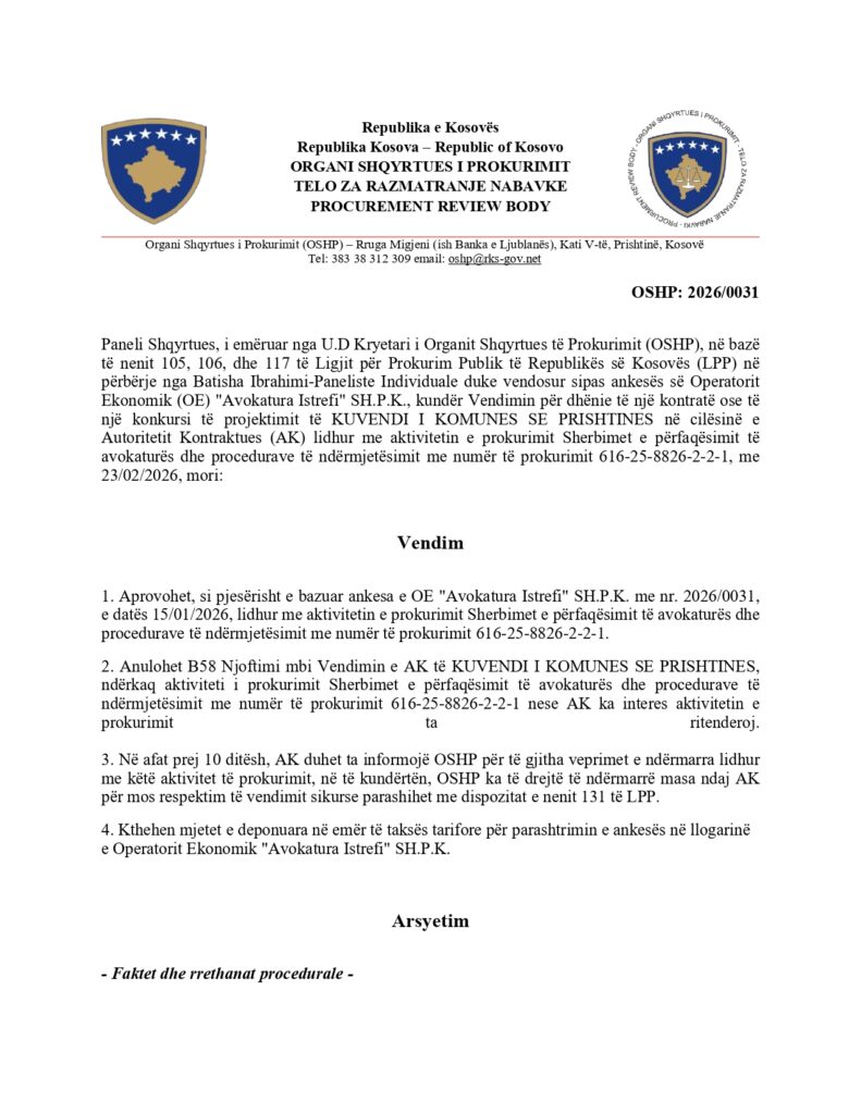 Vendimi i Panelit erdhi pas shqyrtimit të një ankese të paraqitur më 15 janar 2026 nga operatori ekonomik “Avokatura Istrefi” SH.P.K., kundër njoftimit për dhënie kontrate me të cilin Autoriteti Kontraktues kishte rekomanduar për kontratë OE “Sejdiu & Qerkini” SHPK.