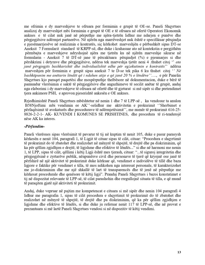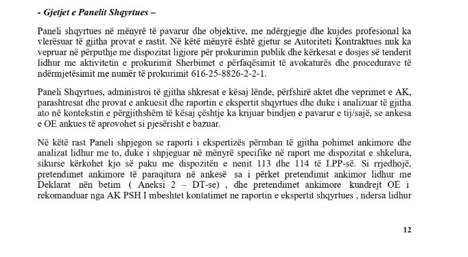 Paneli Shqyrtues vendosi të anulojë njoftimin për dhënie kontrate në kuadër të aktivitetit të prokurimit “Shërbimet e përfaqësimit të avokaturës dhe procedurave të ndërmjetësimit”, me numër 616-25-8826-2-2-1, duke arsyetuar se: “Në këtë aktivitet prokurimi nuk ekziston asnjë ofertë e përgjegjshme, pasi oferta e ankuesit është eliminuar për mangësi të konstatuara, ndërsa oferta e operatorit ekonomik të rekomanduar nuk i përmbush kriteret kualifikuese të përcaktuara në Dosjen e Tenderit dhe në Ligjin për Prokurimin Publik.”