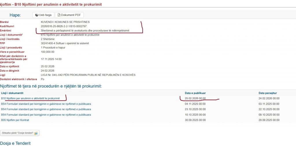 Komuna e anuloi në tërësi aktivitetin e prokurimit për “Shërbimet e përfaqësimit të avokaturës dhe procedurave të ndërmjetësimit”, me vlerë të parashikuar 100 mijë euro, pasi në procedurën e shqyrtimit administrativ janë konstatuar shkelje që kanë bërë të pamundur dhënien e ligjshme të kontratës. Bëhet fjalë për tenderin me numër 616-25-8826-2-2-1, i zhvilluar nga Komuna e Prishtinës me procedurë të hapur.