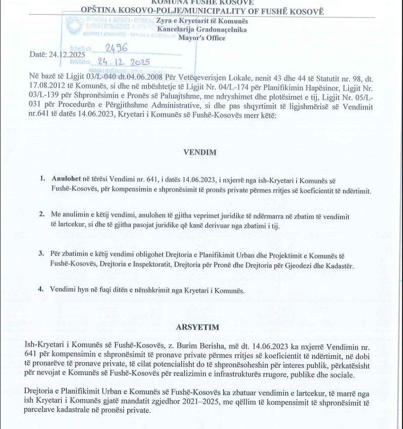 Kryetari i Komunës së Fushë-Kosovës, Valon Prebeza ka marrë vendim për anulimin e plotë të Vendimit nr. 641, të datës 14 qershor 2023, të nxjerrë nga ish-kryetari i komunës, Burim Berisha, i cili kishte paraparë kompensimin e shpronësimit të pronave private përmes rritjes së koeficientit të ndërtimit, shkruan Kujdestari.info.