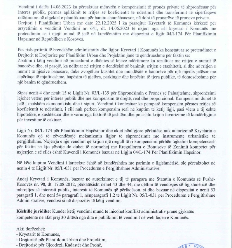 Në dokument thuhet se vendimi i vitit 2023 ishte nxjerrë me qëllim të kompensimit të pronarëve të pronave private që potencialisht do të shpronësoheshin për interes publik, përkatësisht për realizimin e infrastrukturës rrugore, publike dhe sociale në territorin e Komunës së Fushë-Kosovës. Kompensimi ishte paraparë përmes rritjes së koeficientit të ndërtimit dhe transferimit të sipërfaqeve ndërtimore në objekte banimi shumëbanesor.
