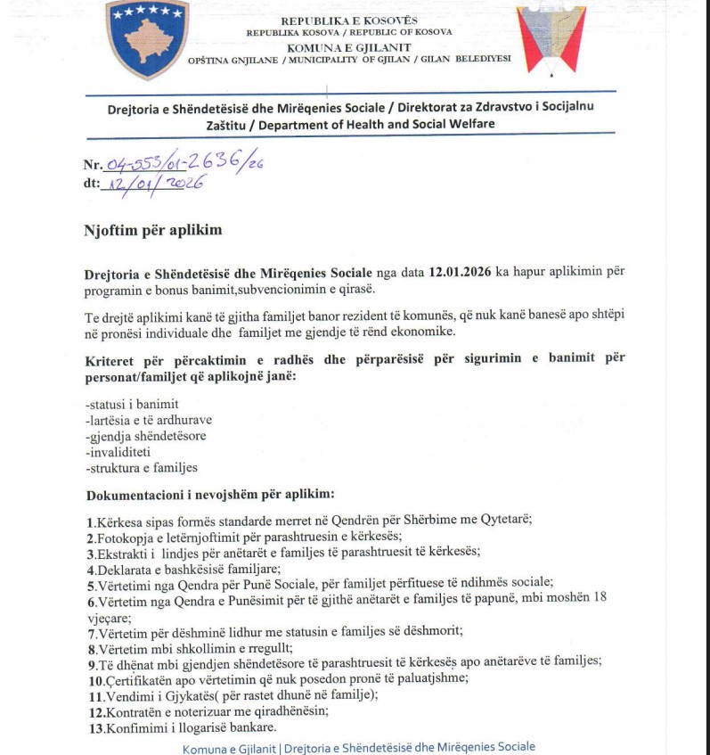 Informata shtesë rreth aplikimit mund të merren pranë Drejtorisë së Shëndetësisë dhe Mirëqenies Sociale të Komunës së Gjilanit. /Kujdestari.info/