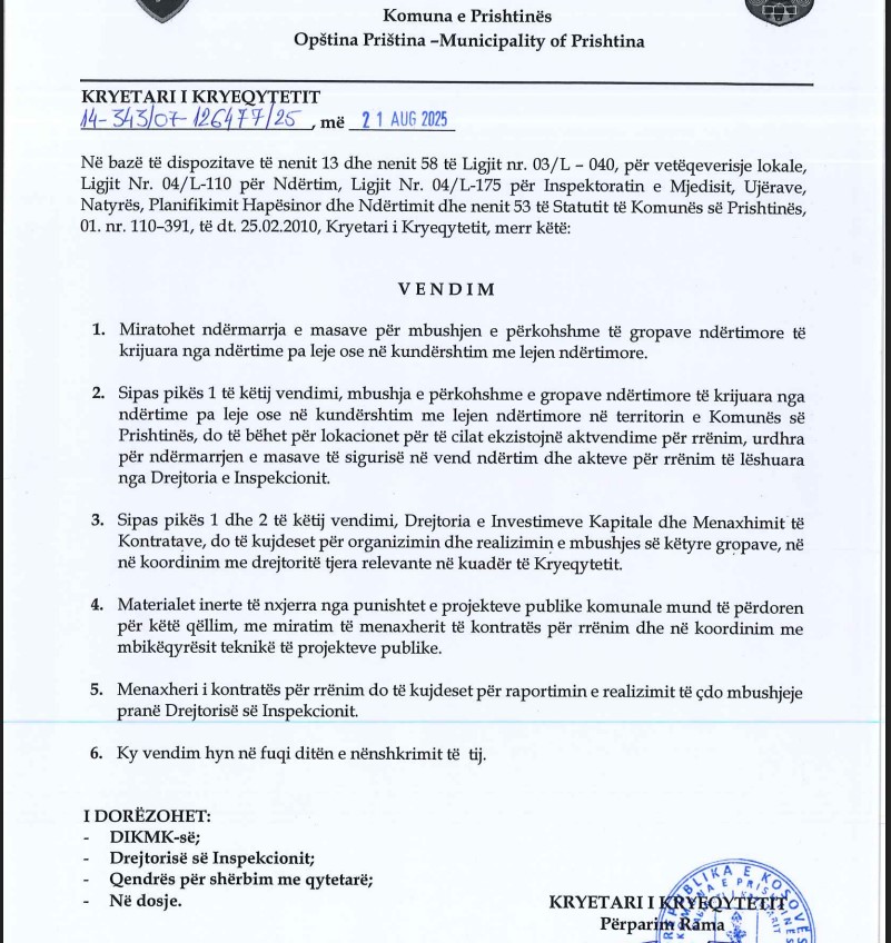 Komuna e Prishtinës ka nxjerrë një vendim të ri, i cili tregon më qartë se kurrë se kryeqyteti është i mbushur me ndërtime pa leje dhe gropa ndërtimore që rrezikojnë sigurinë publike. Në vend që të ketë rrënime të plota apo zgjidhje afatgjata, Komuna ka vendosur që këto gropa të mbushen “përkohësisht”, madje duke përdorur materiale inerte të nxjerra nga projektet publike.