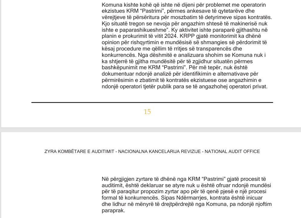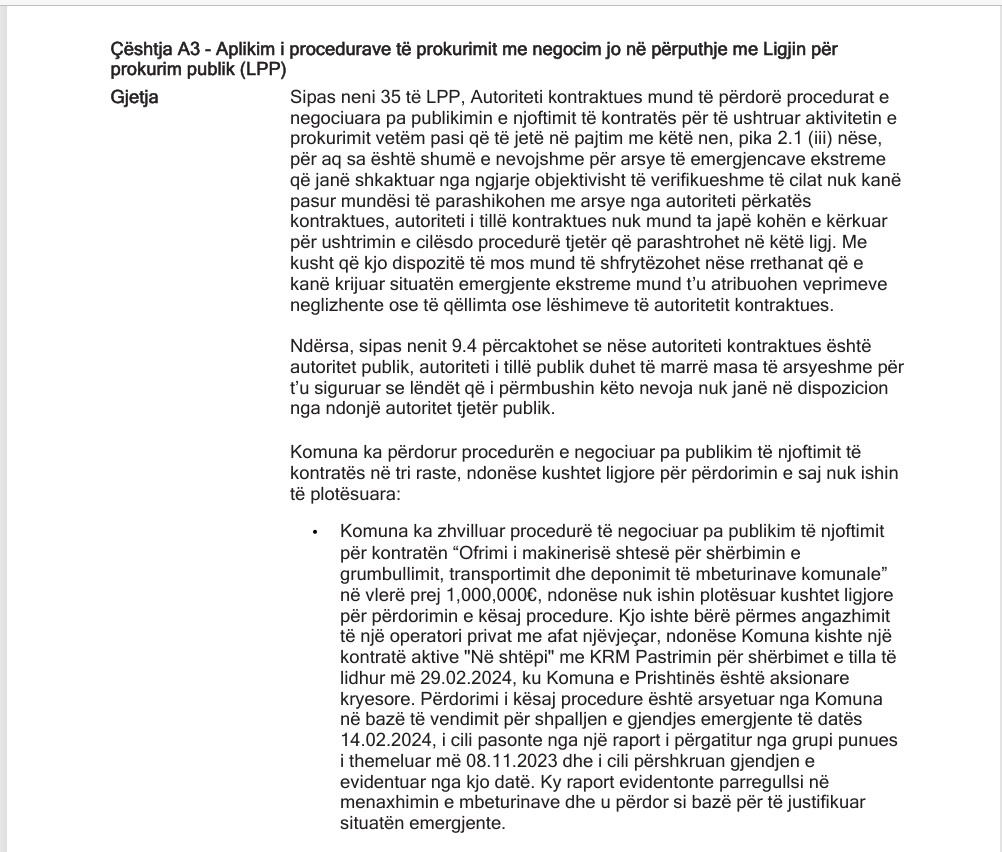 Në mesin e kontratave të përmendura nga Auditori ishte edhe ajo për angazhimin e makinerisë shtesë për mbeturina, me vlerë rreth 1 milion euro, e arsyetuar nga Komuna si situatë emergjente. Sipas ZKA-së, kjo situatë nuk ishte as e papritur dhe as e paparashikueshme, pasi aktiviteti ishte i përfshirë në planin vjetor të prokurimit dhe problemet me “Pastrimin” ishin të njohura më herët.