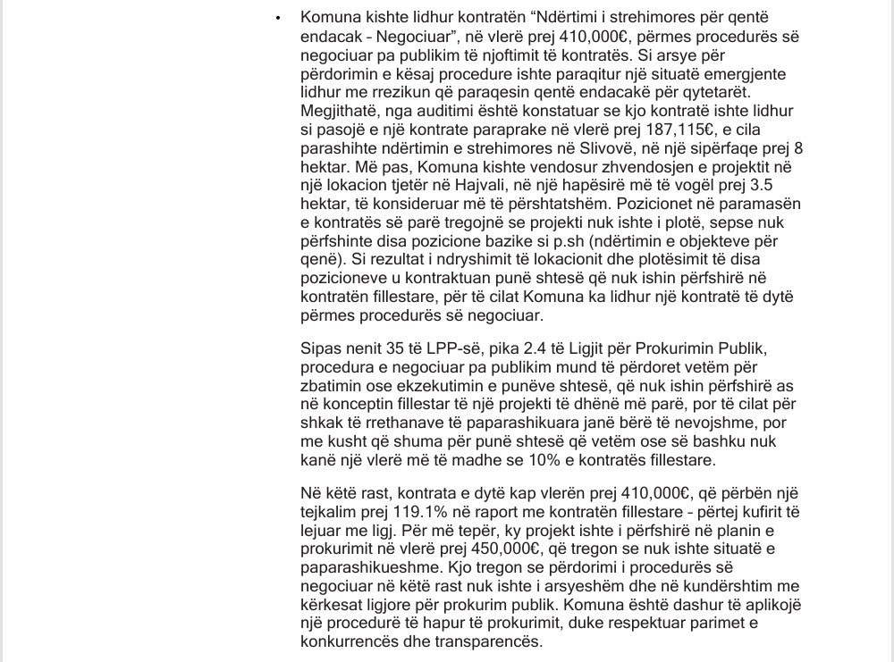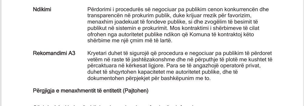 Këto praktika janë trajtuar edhe nga Zyra Kombëtare e Auditimit (ZKA), e cila në raportin e saj për pasqyrat financiare të Komunës së Prishtinës ka identifikuar përdorim të pajustifikuar të procedurës së negociuar pa publikim, në kushte që nuk përmbushnin kriteret ligjore për emergjencë apo paparashikueshmëri.