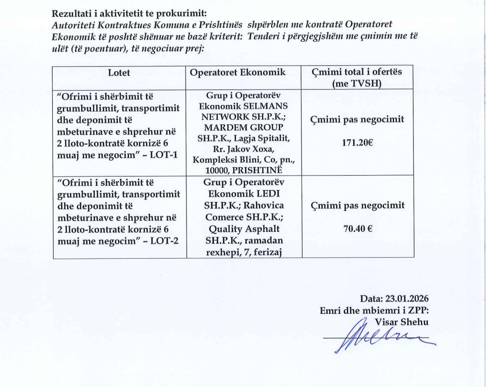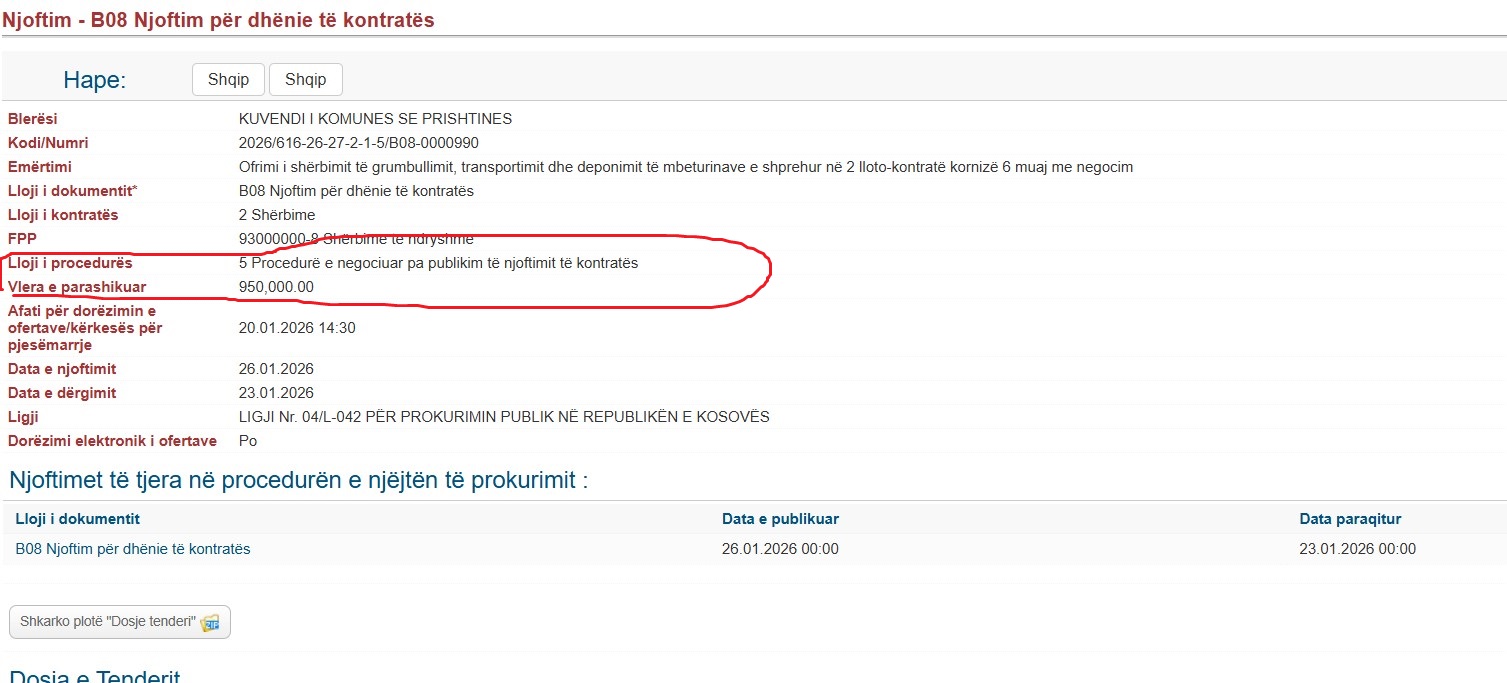 Komuna e Prishtinës ka lidhur sërish kontrata për shërbimin e grumbullimit, transportimit dhe deponimit të mbeturinave në kontejnerë përmes procedurës së negociuar pa publikim të njoftimit për kontratë. Sipas njoftimit B08 për dhënie të kontratës, të përgatitur më 23 janar 2026, bëhet fjalë për një kontratë kornizë gjashtëmujore, të ndarë në dy llote, me vlerë maksimale të parashikuar deri në 950 mijë euro, e cila do të vlejë deri në shpenzimin e plotë të kësaj shume, shkruan Kujdestari.info.