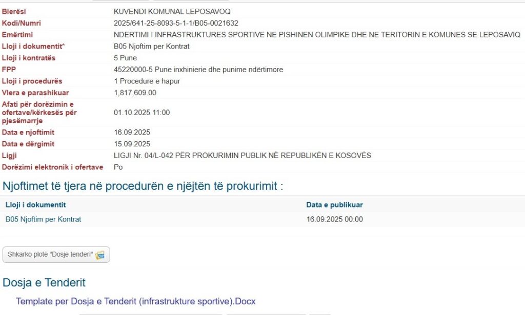 Komuna e vogël e Leposaviqit, e banuar me shumicë serbe, ka shpallur një nga tenderët më të mëdhenj të viteve të fundit, duke planifikuar ndërtimin e një infrastrukture sportive me vlerë 1.817.609 euro. Projekti, i quajtur “Ndërtimi i infrastrukturës sportive në pishinën olimpike dhe në territorin e Komunës së Leposaviqit”, përfshin disa lokacione të shpërndara, si kompleksi sportiv, salla sportive në qytet, pishina olimpike, si dhe fshatrat Bistricë dhe Cerajë, shkruan Kujdestari.info.