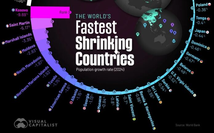 Sipas të dhënave të Bankës Botërore, 42 vende dhe territore po tkurren aktualisht, me disa prej tyre që përjetojnë rënie më të shpejta se të tjerat. Në këtë infografikë, paraqiten zonat ku po ndodhin tkurrjet më të shpejta, sipas të dhënave të vitit 2024.