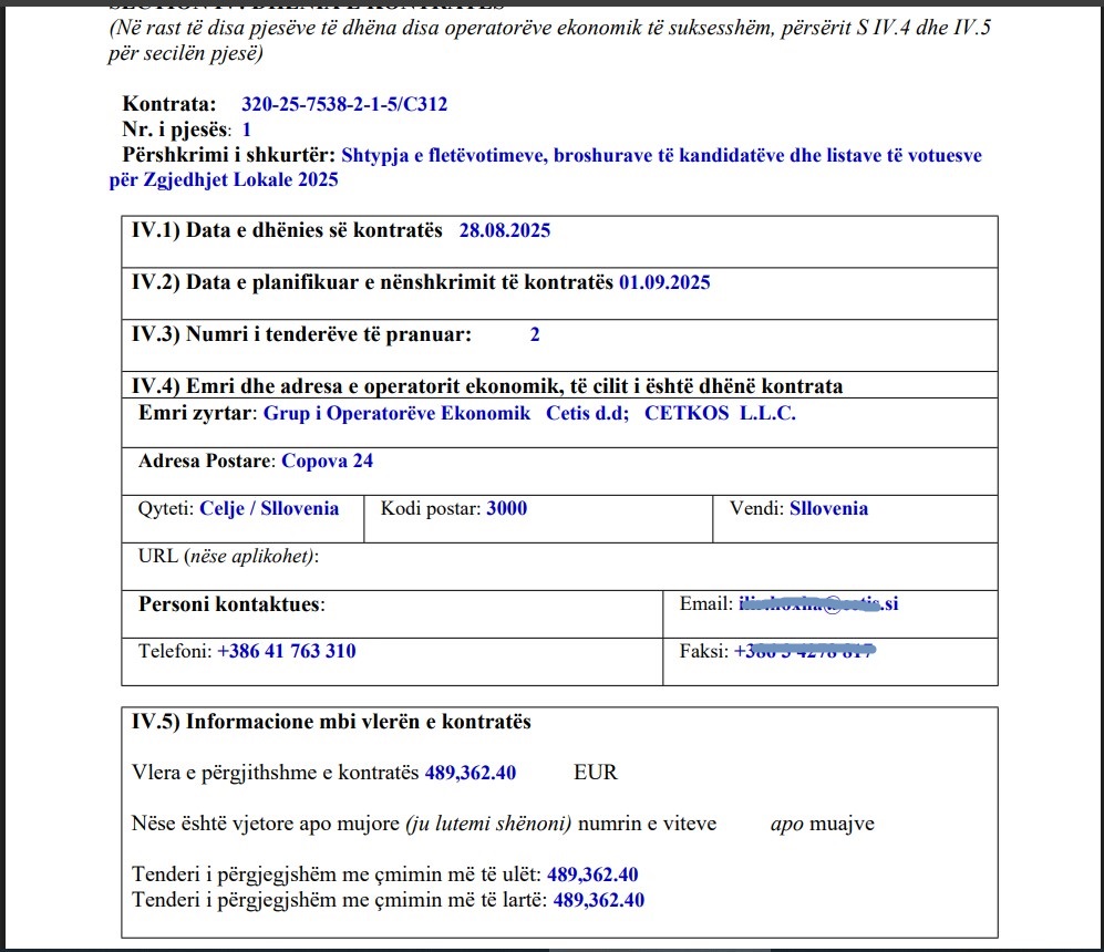 Përmes kësaj procedure, KQZ ka rekomanduar dhënien e kontratës për tenderin “Shtypja e fletëvotimeve, broshurave të kandidatëve dhe listave të votuesve për Zgjedhjet Lokale 2025”. Përfitues është konsorciumi Cetis d.d. dhe CETKOS L.L.C., me lider nga Sllovenia, ndërsa e dyta nga Kosova. Vlera e kontratës është 489,362.40 euro.