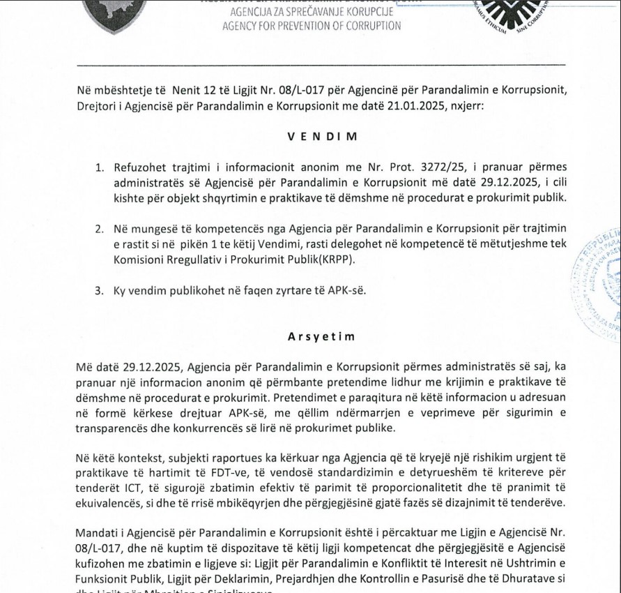 “Subjekti raportues ka kërkuar nga Agjencia që të kryejë një rishikim urgjent të praktikave të hartimit të FDT-ve, të vendosë standardizimin e detyrueshëm të kritereve për tenderët ICT, të sigurojë zbatimin efektiv të parimit të proporcionalitetit dhe të pranimit të ekuivalencës”, thuhet në arsyetimin e vendimit.