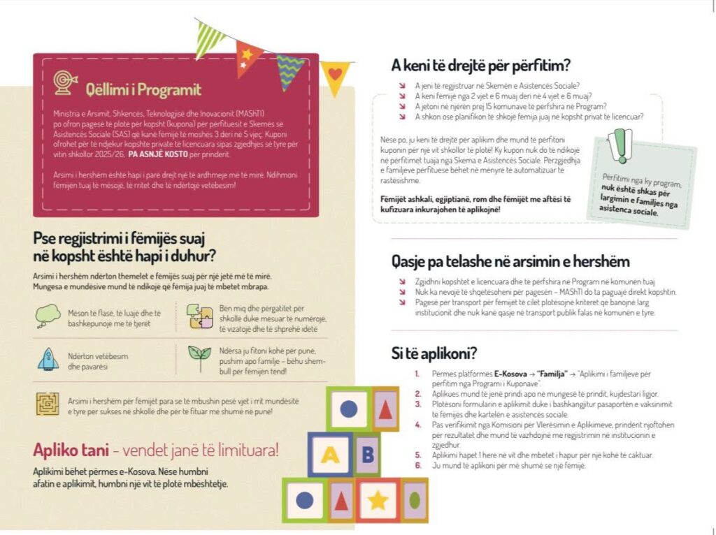 Ministria e Arsimit, Shkencës, Teknologjisë dhe Inovacionit (MAShTI) ofron pagesë të plotë për kopsht (kuponë) për përfituesit e Skemës së Asistencës Sociale (SAS) që kanë fëmijë të moshës 3 deri në 5 vjeç. Kuponi ofrohet për të ndjekur kopshte private dhe kopshte publiko-private të licencuara për vitin shkollor 2025/26, pa asnjë kosto për prindërit, raporton Kujdestari.info.
