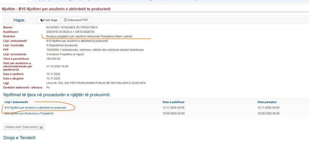 Projekti për ndërtimin e Memorialit Përkujtimor “Adem Jashari” në Prishtinë po shndërrohet në një nga proceset më të dështuara të këtij mandati në kryeqytet. Për herë të dytë, kjo nismë ka mbetur pa asnjë ofertues, pavarësisht se Komuna kishte hapur një konkurs të ri të projektimit, me vlerë 150 mijë euro. Këtë herë, procesi ngeci që në hapjen e ofertave, pasi më 3 nëntor, komisioni komunal konstatoi se në garë nuk ishte paraqitur asnjë operator ekonomik.