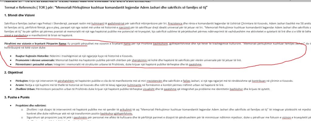 “Përafrimi me vizionin e kryetarit Përparim Rama”Pra, memoriali nuk është vetëm përkujtim, por edhe një pajisje multifunksionale që i shërben “Prishtinës gjithëpërfshirëse” dhe, natyrisht, vizionit të kryetarit për ta bërë kryeqytetin “fener të trashëgimisë kulturore”.