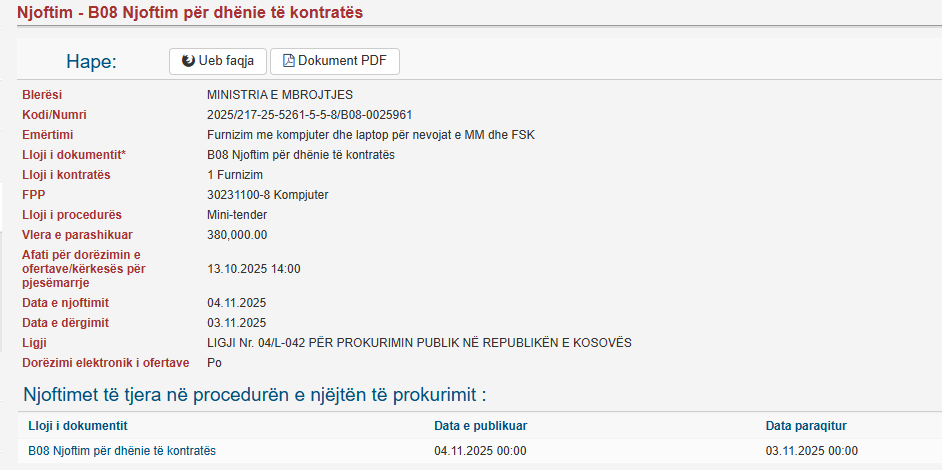 Sipas njoftimit të autoritetit Kontraktues, vlera e parashikuar për këtë tender ishte 380 mijë euro, dhe parashiheshin të bleheshin 66 laptopë dhe 300 kompjuterë bashkë me desktop.